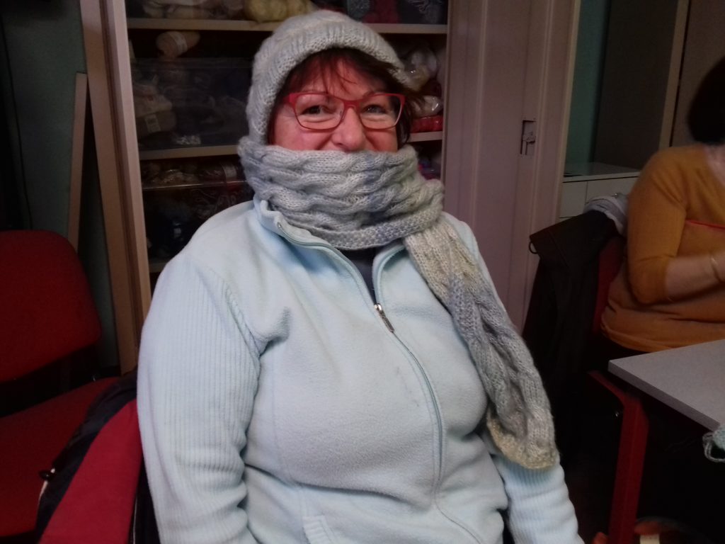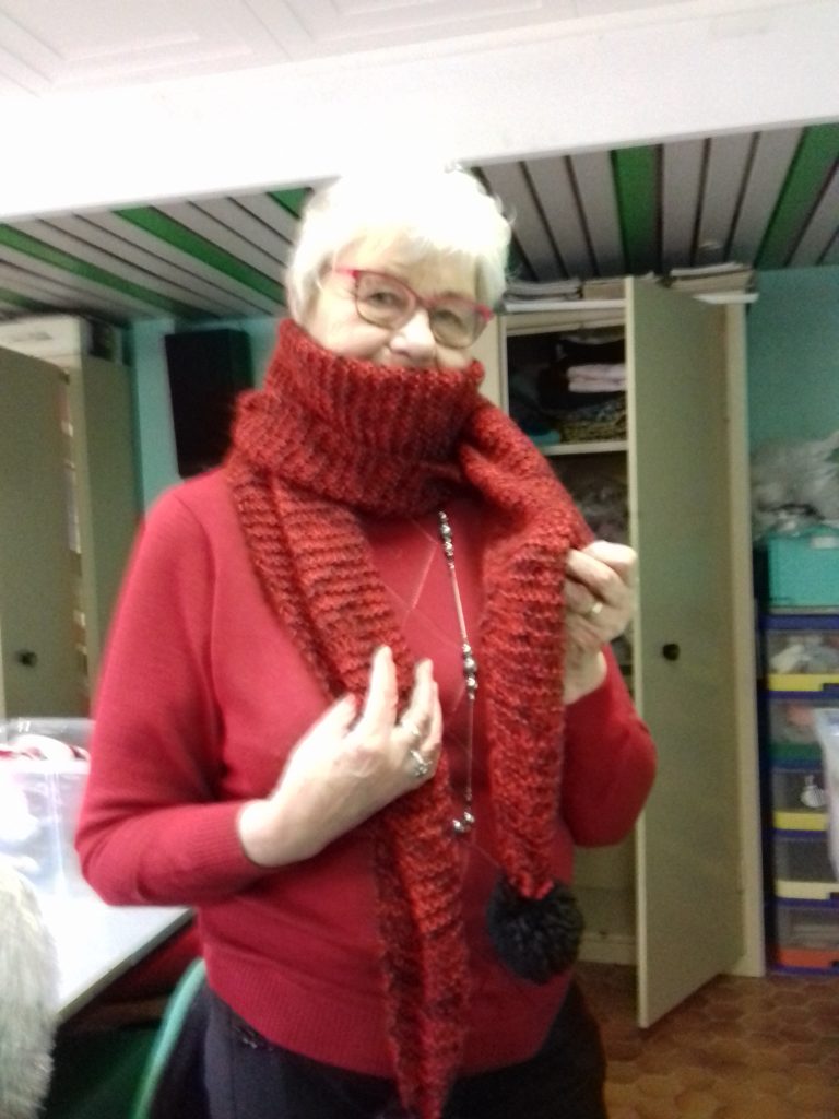 Photo 2 et 3 : Au local, Paulette et Marie-Thérèse testent la chaleur des écharpes.