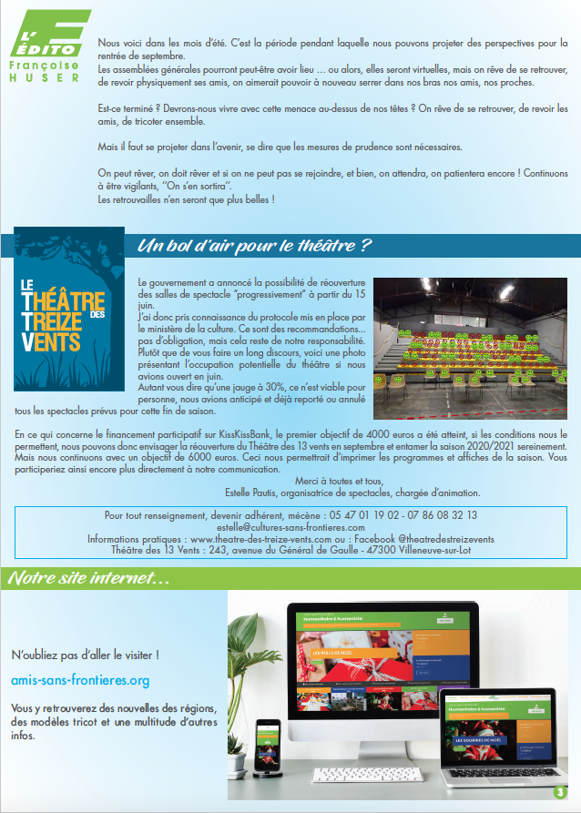 « La Sphère »: mensuel édité par : « Amis Sans Frontières », 1, Chemin de la Coopérative 47300 Villeneuve-sur-Lot (France) – Tél. : 05 53 41 04 94 – Courriel : amis.sans.frontieres@wanadoo.fr – Site : amis-sans-frontieres.orgCourriel rédaction : amis.sans.frontieres@wanadoo.frDirectrice de publication : Françoise Huser, Secrétaire de rédaction : Edith Delas, Service abonnements : Patricia Henenbelle, graphisme et mise en page et impression : Com’ Pour Vous – 47300 Villeneuve-sur-Lot, Relecture : Gérard Léoka. Ont participé à la rédaction de ce numéro : Françoise Huser • Maryse Degallaix • Suzanne Pascal • Jocelyne Romain • Evelyne Bonaventure • Eliane Jupin • Marie Panchèvre • Jeannine Guillout • Évelyne Wolff • Nadine Pradels • Édith Delas • Lysiane et Michel Colin • Anny Boizet • Gérard Léoka • Maryvonne Aupée Crédits Photos : Bernard Devloo – Gérard Léoka – M. Aupée PXHERE – Créative commons CC0. Prix abonnement annuel (11 numéros) 25€, prix au numéro 2,50€, C.P.P.A.P. 0523 G 88065, ISSN 0983-4443 – Dépôt légal à parution. L’utilisation même partielle des textes, illustrations et photos, ne peut se faire sans l’accord de la rédaction.