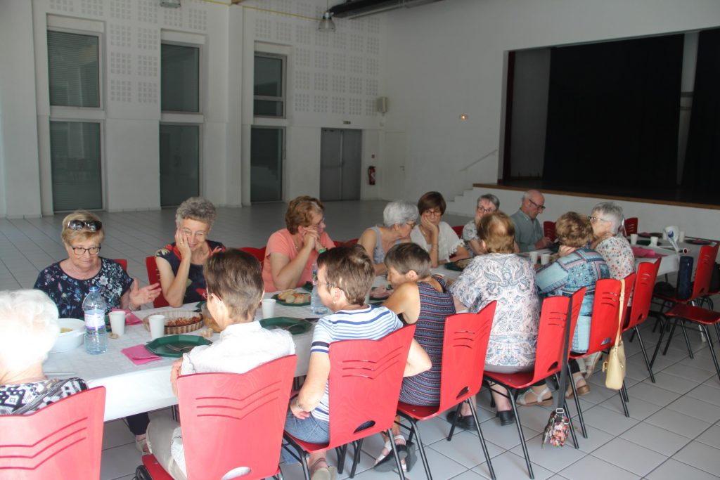 A la manœuvre : Christian, Yves et André, installent les lourdes tables et les chaises , le couvert est mis, nous sommes un peu « écolos » alors Nanou ressort les assiettes « lavables », chacune a réalisé son plat favori, salé ou sucré et il y a de la bonne humeur, le plaisir de se retrouver est là !
